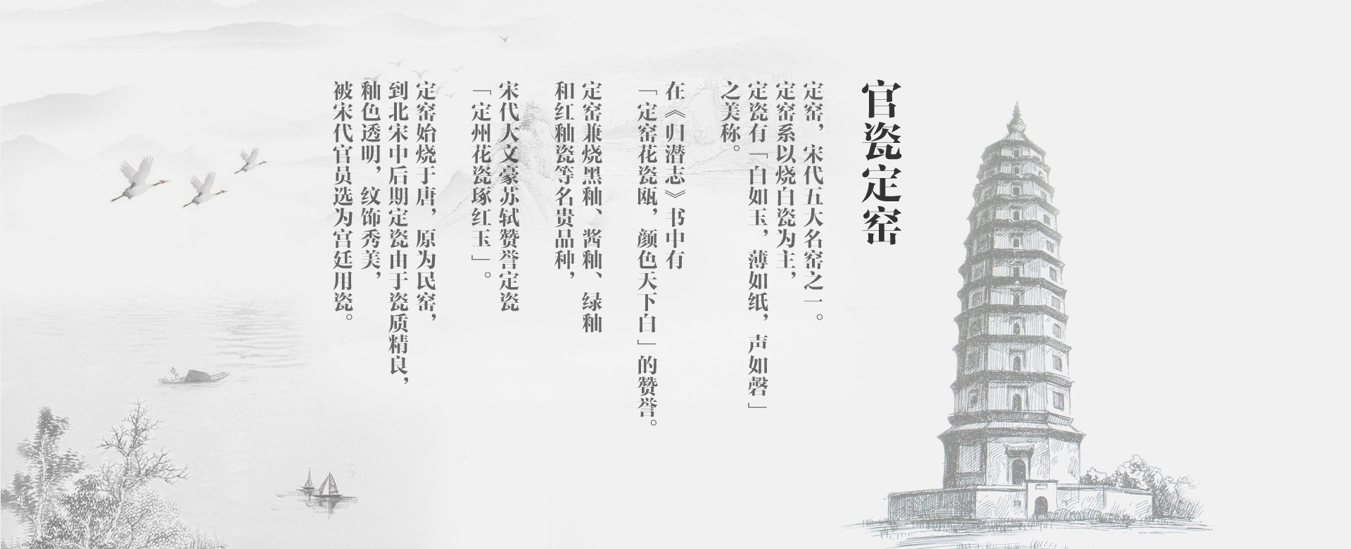 定窯為宋代五大名窯之一,窯址在今河北省曲陽(yáng)澗滋村、野北村及東西燕村,在宋代屬定州,故名。創(chuàng)燒于唐,極盛于北宋及金,終于元。以產(chǎn)白瓷著稱(chēng),兼燒黑釉、醬釉和釉瓷,文獻(xiàn)分別稱(chēng)其為“黑定”、“紫定”和“綠定”。